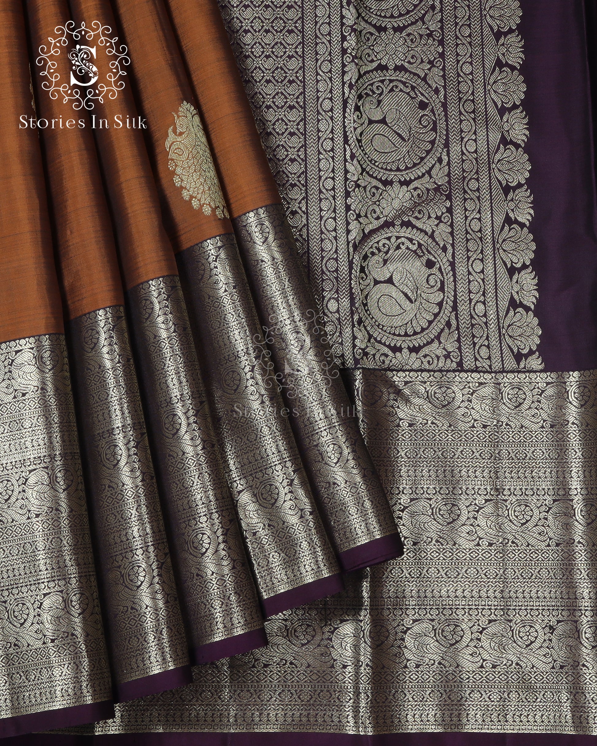 An exquisite silk saree in a rich antique bronze tone, beautifully contrasted with intricate silver-toned zari work. The detailed border and traditional motifs lend a regal depth, while the smooth silk body ensures a graceful, fluid drape. Refined and timeless, this saree is ideal for weddings, festive occasions, and moments that call for classic grandeur with understated elegance.